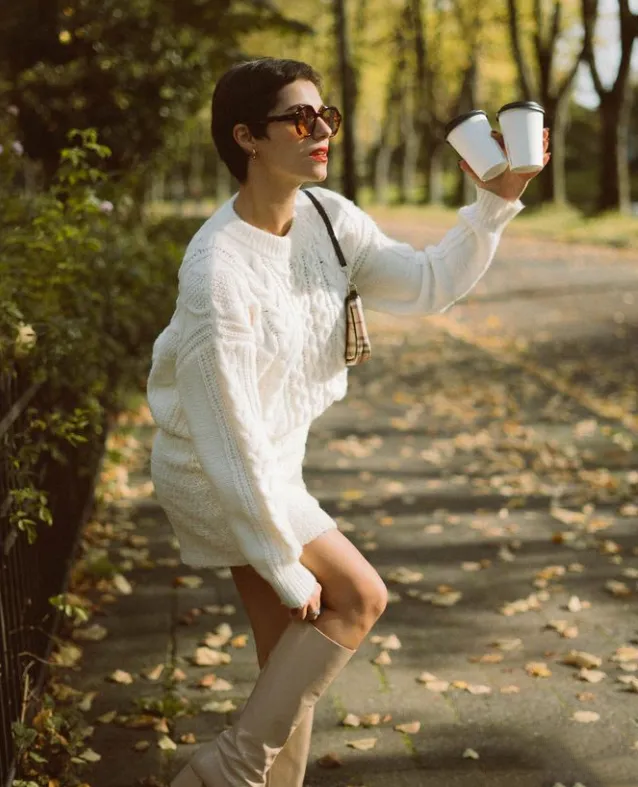 Paired with dark pants, such as dark gray, the cream-colored sweater can be more prominent, while also enhancing the body shape and showing the charming curves. If you want to try some bold combinations, you can choose to pair it with a pleated skirt or a floral skirt to show a fashionable and avant-garde side.