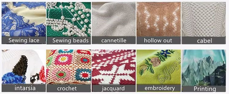 Pulls brodés : Les pulls sont brodés de divers motifs floraux, à la main ou à la machine. Les motifs sont délicats, raffinés et colorés, et se trouvent principalement sur les vêtements pour femmes et enfants. Les pulls brodés comprennent des pulls de couleur naturelle, des pulls de couleur unie, des pulls colorés, des pulls en velours, des pulls en soie et des pulls brodés de fils d'or et d'argent.