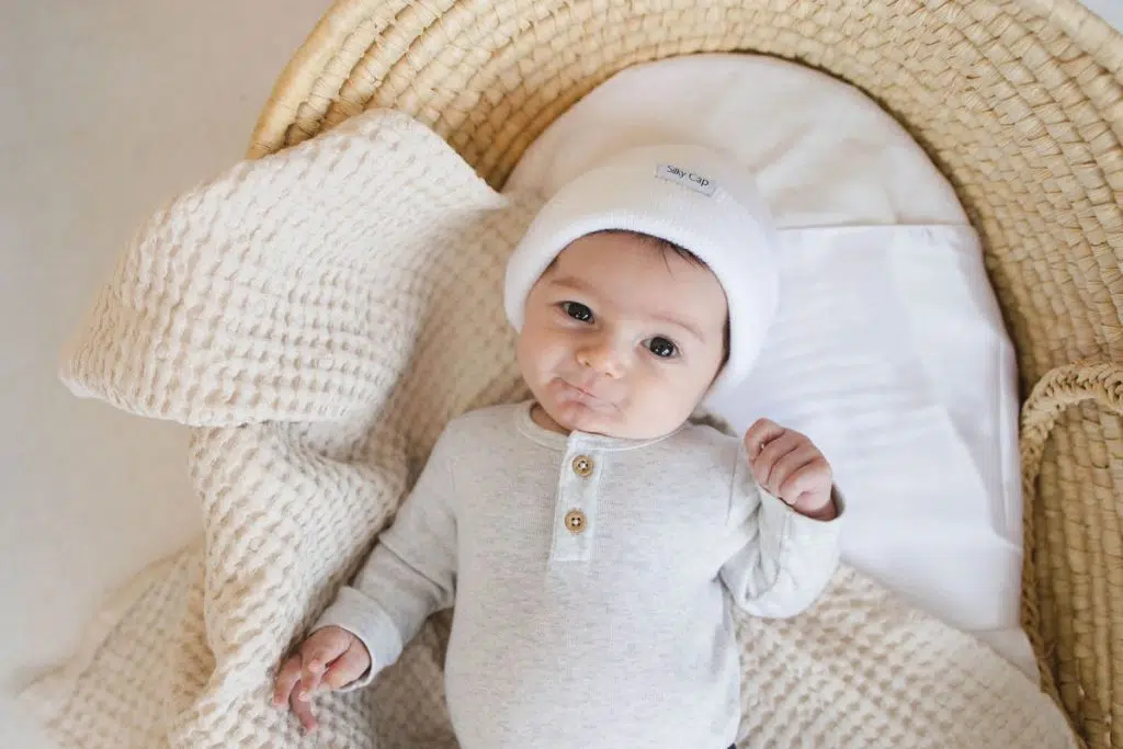 First, unbutton your baby’s shirt to slowly dissipate heat and wipe away any sweat from their head and body with a dry towel. Once your baby has adjusted to the room temperature, lift the hat slightly higher before removing it completely.
