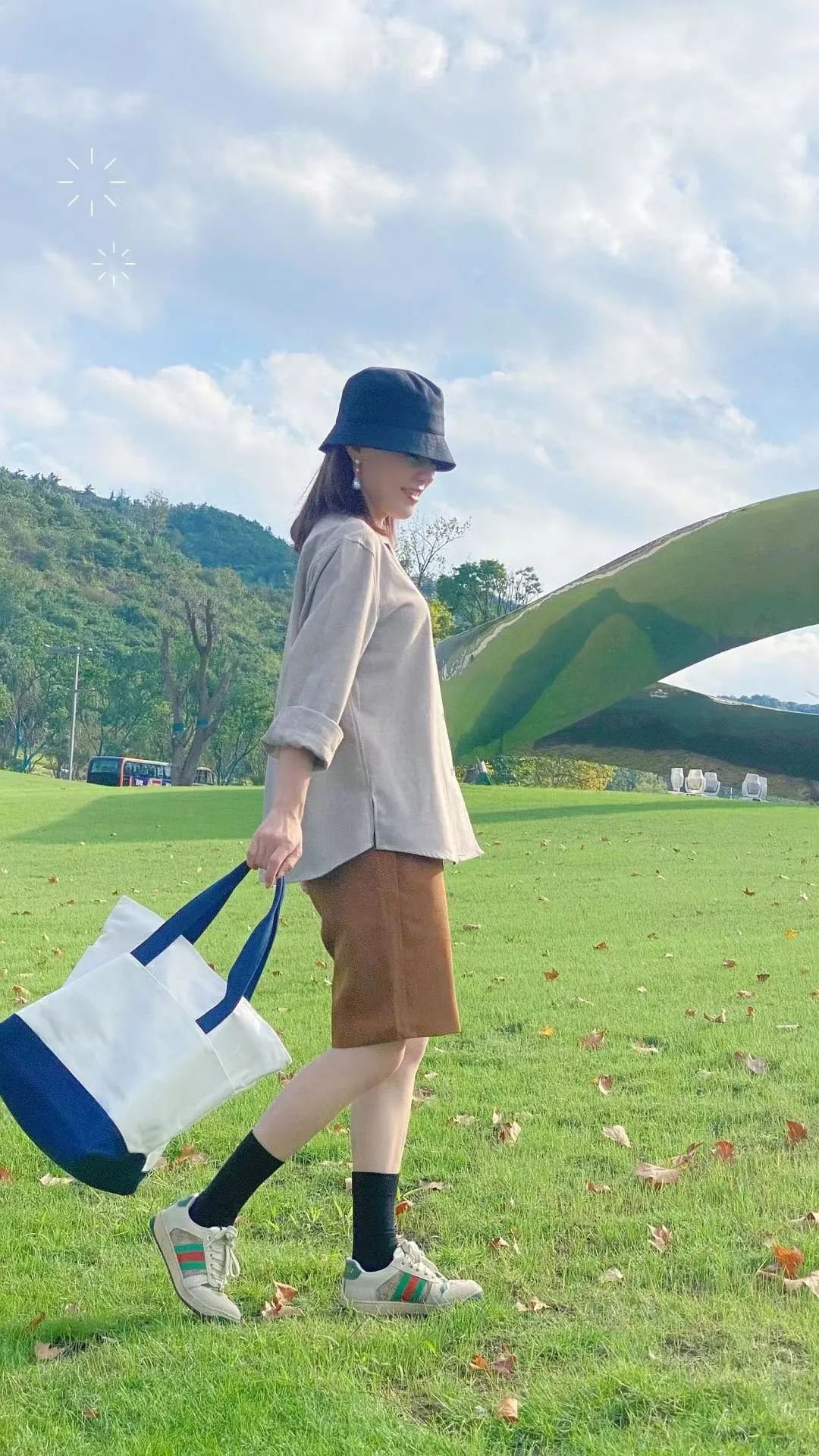 Please, dare to try. Black fisherman hats are also great accessories to combine with light-colored and intellectual outfits. The white flowing viscose shirt with the special smooth and elegant touch of satin, pairs with a pair of khaki high-waisted and wide-leg pants, which can form a contrast between the slim waistline and hipline. Therefore, the whole look is full of the beauty of a slim waist and a plump hip, showing a sense of sexiness except for elegance.