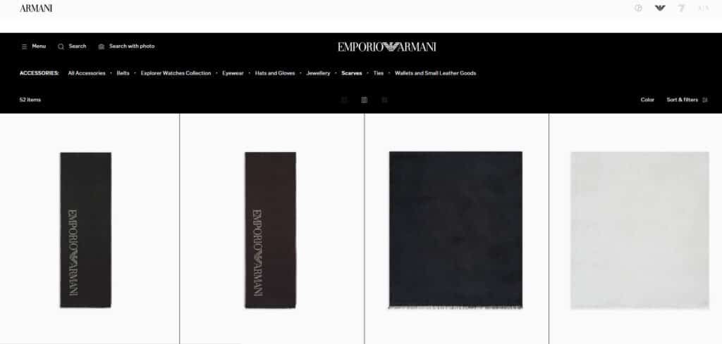 Armani славится своей косметикой, одеждой, аксессуарами, а также превосходными шарфами. Всемирно известный модный бренд, основанный в Милане, Италия, в 1975 году, после многих лет развития стал мировым брендом шарфов высшего уровня. Другие виды одежды, парфюмерии и аксессуаров также считаются высококлассными.