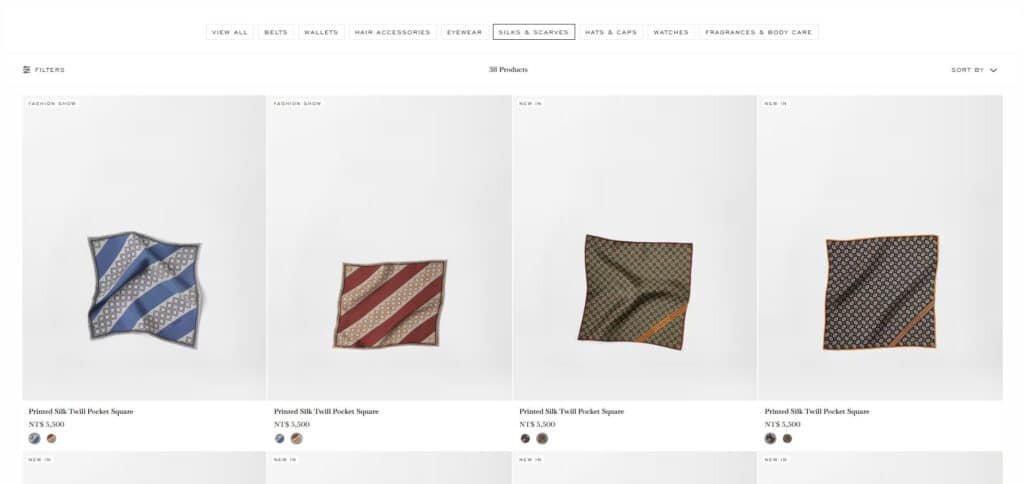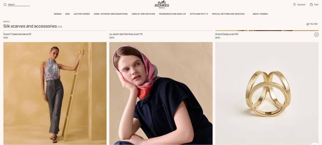 Из всех изделий Hermès самыми известными и продаваемыми, несомненно, являются его изысканные шелковые платки. С момента выпуска первого шелкового шарфа в 1937 году в честь 100-летнего юбилея магазина шелковые шарфы Hermès стали популярным подарком среди мужчин и женщин высшего класса.
